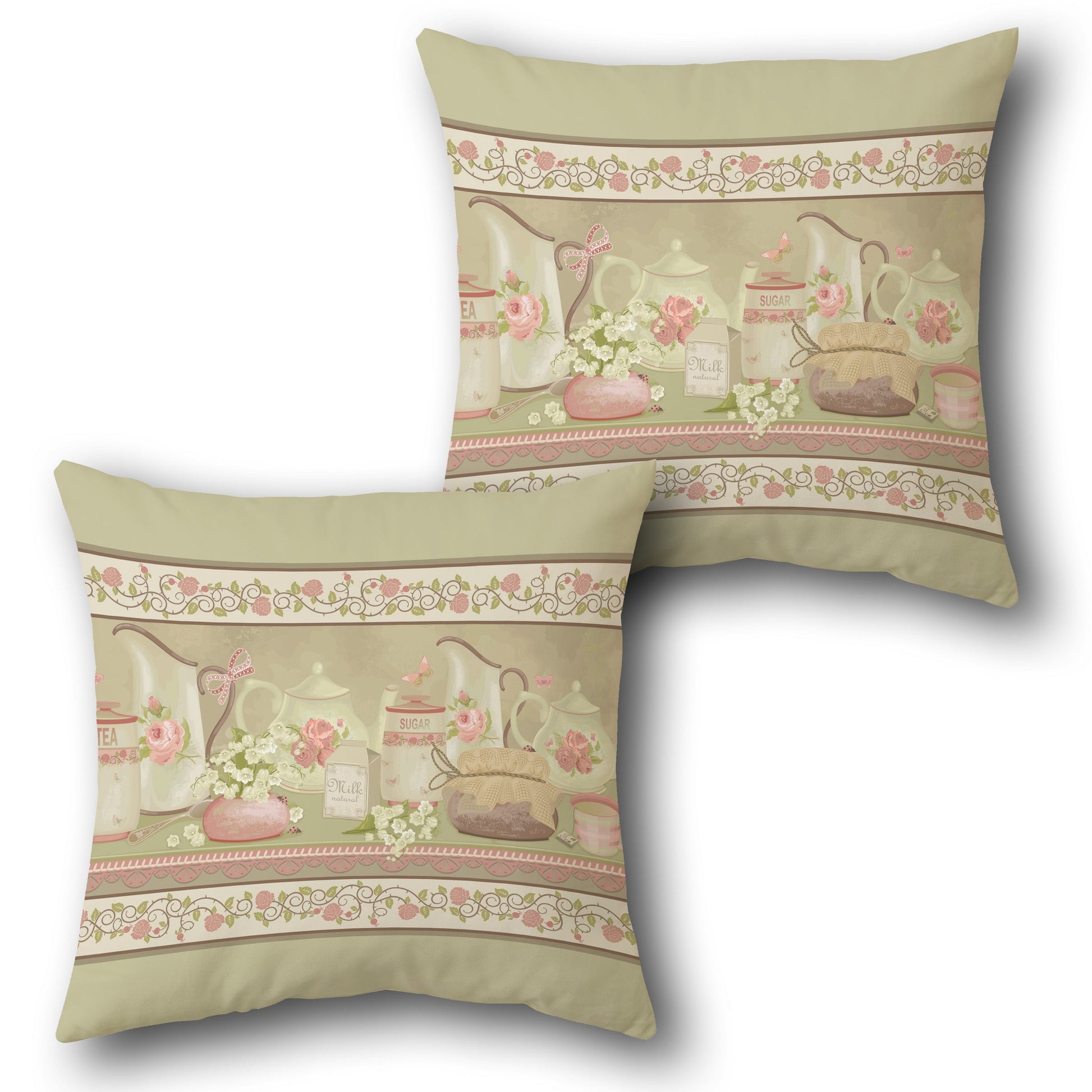 This cushion features a dual-sided design with a nostalgic kitchen theme. Both sides display a charming illustration of vintage teapots, jars labeled "Tea," "Milk," and "Sugar," and a jam jar, all adorned with soft pink roses and small white flowers. The scene is framed by a delicate border of pink roses and green leaves on a muted sage green base, giving it a cozy, rustic feel. The pastel tones of pink, white, and green create a soft, vintage aesthetic.