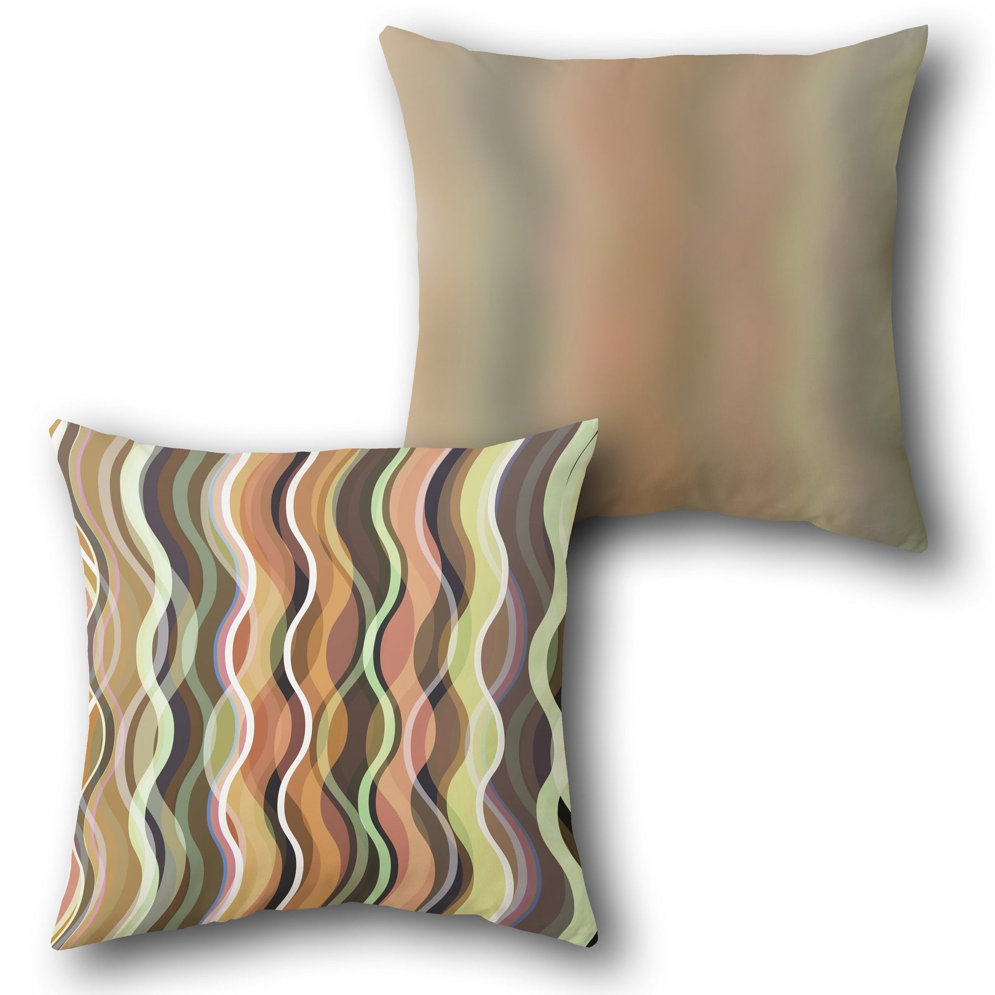 This cushion features a vibrant wavy pattern on the front, with flowing, curved lines in a mix of earthy tones including shades of terracotta, olive green, mustard yellow, and deep brown, reminiscent of desi colors like "mitti," "pehla," and "bhura." The back has a gradient design transitioning from a soft beige to a muted peach, giving a subtle contrast to the dynamic front. The base color of the cushion is a neutral beige, akin to the desi shade "kora."