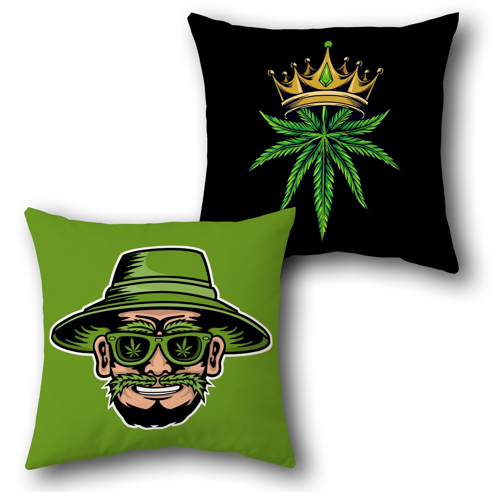 Bring a dose of high vibes to your room with this funky throw Cushion ! One Cushion features a crowned marijuana leaf symbolizing royalty, while the other showcases a grinning cartoon stoner with cannabis shades and a leafy mustache. This is perfect for fans of cannabis culture and urban cool aesthetics.
