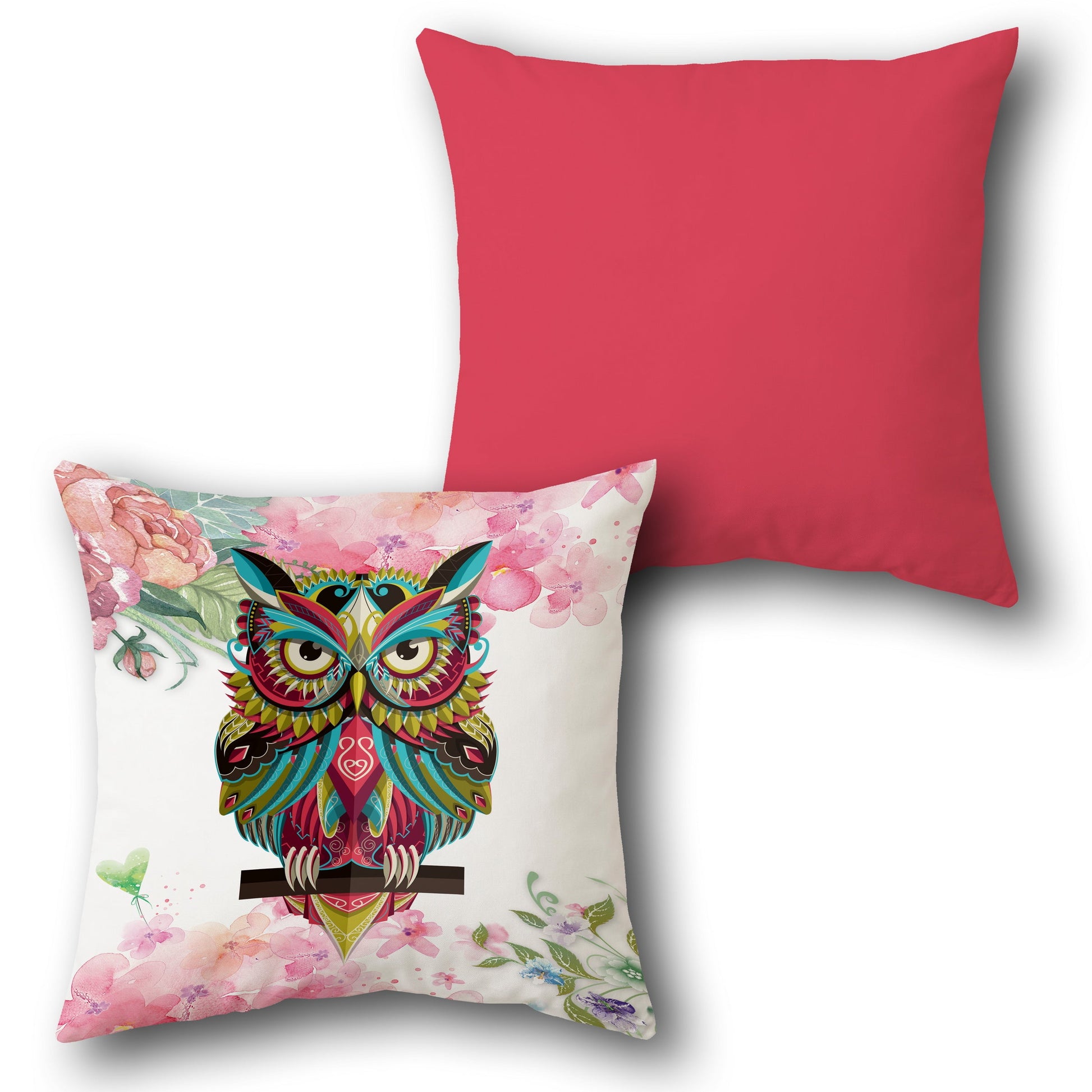 This includes two square Cushions. The first Cushion has a white base color with a colorful illustration of an owl in shades of blue, pink, yellow, and green, surrounded by watercolor-style pink floral patterns. The second Cushion has a solid pink base color, complementing the floral theme of the first.