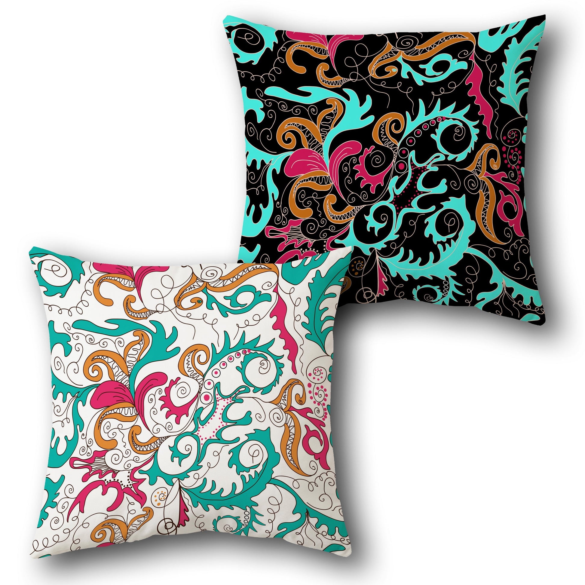This single cushion features a dual-sided design with a vibrant swirl pattern. The front displays an intricate swirl pattern in teal, pink, orange, and black on a white base, creating a lively and artistic look. The back reverses the base color with the same swirl pattern in teal, pink, orange, and white on a black base, offering a bold and dynamic contrast to the front.