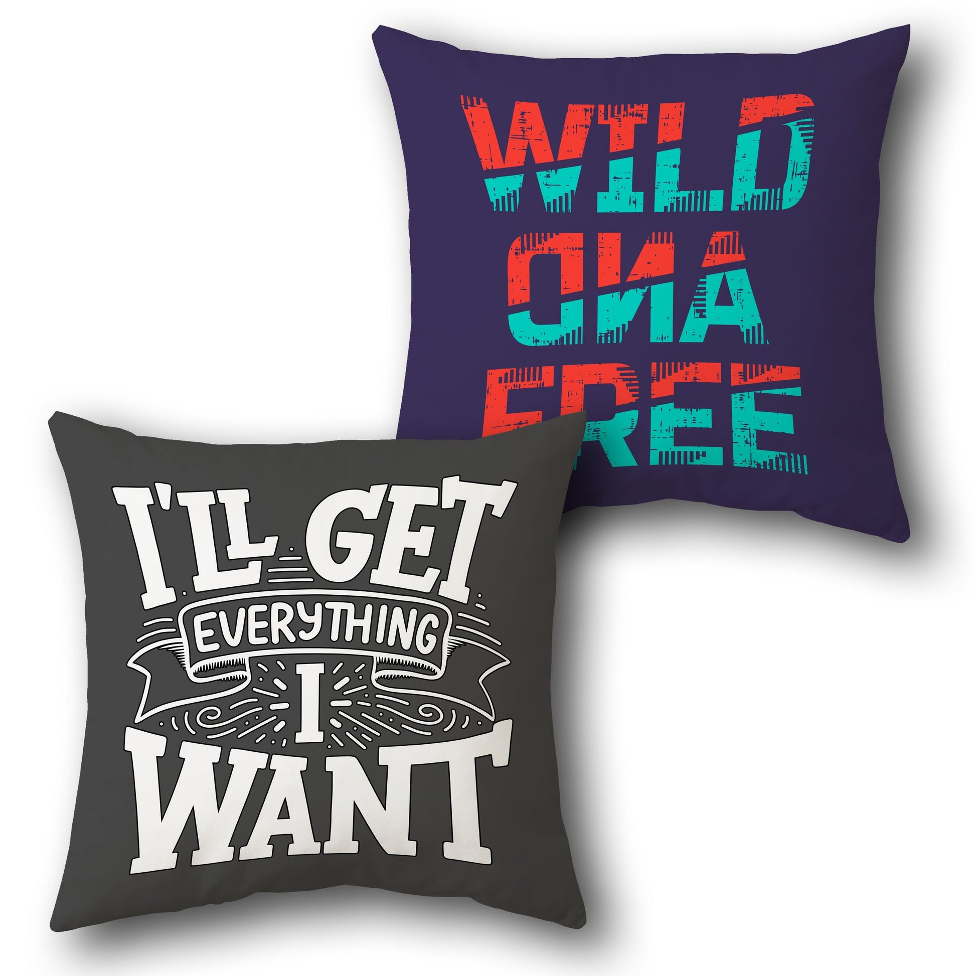 This single cushion features a striking front and back design. The front has a dark grey base color with the phrase "I'LL GET EVERYTHING I WANT" in bold white lettering, accented with a decorative banner around "EVERYTHING" in black and white. The back showcases a deep purple base color with the words "WILD ON A FREE" in large, distressed text, with "WILD" in red and "ON A FREE" in teal, creating a vibrant contrast.