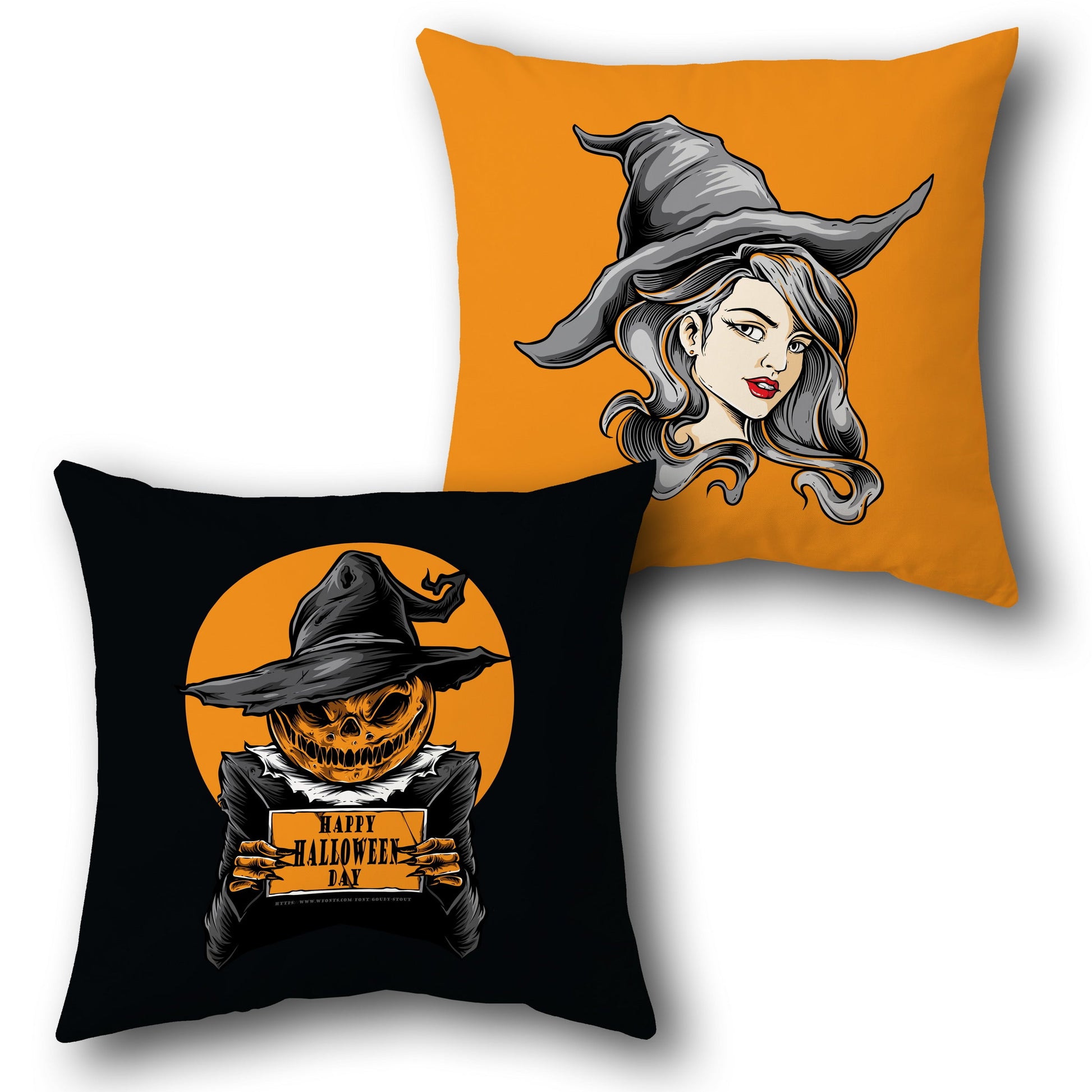 Add a spooky yet stylish flair to your Halloween decor with this enchanting Cushion design . This-piece features one Cushion with a striking illustration of a gothic witch woman in a classic pointed hat on a vivid orange background. The second Cushion shows a menacing pumpkin-headed scarecrow holding a “Happy Halloween Day” sign under a glowing orange moon, all against a black base. These designs bring a modern, edgy twist to traditional Halloween themes—perfect for parties, haunted house vibes, or just spooky season fun!