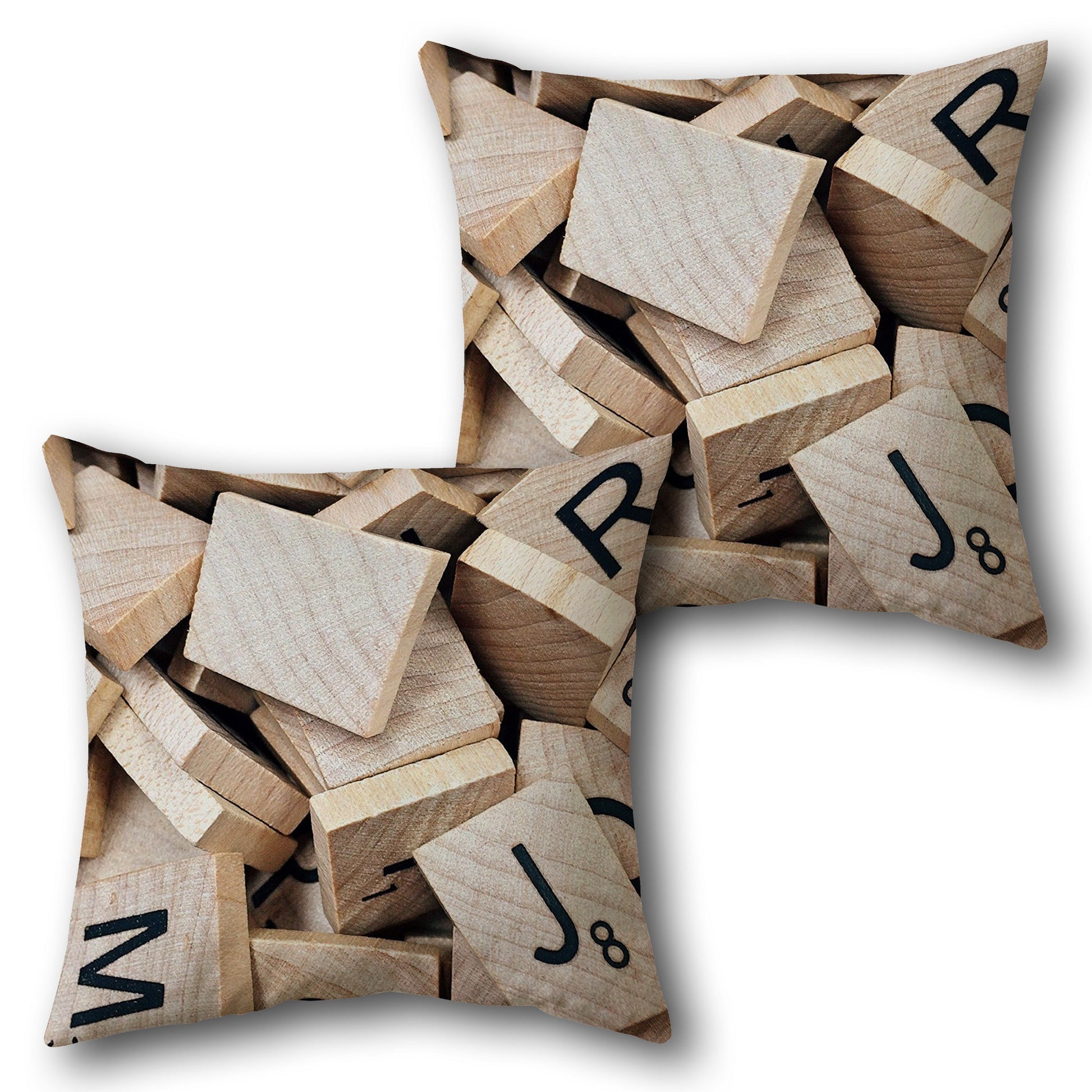 Enhance your decor with the Word Game Tiles Cushion , featuring a scattered collection of wooden game tiles with black letters, reminiscent of classic word games like Scrabble. The light wood tones of the tiles create a warm, inviting look, perfect for adding a touch of intellectual charm to a reading nook, living room, or game space. This includes square Cushions.