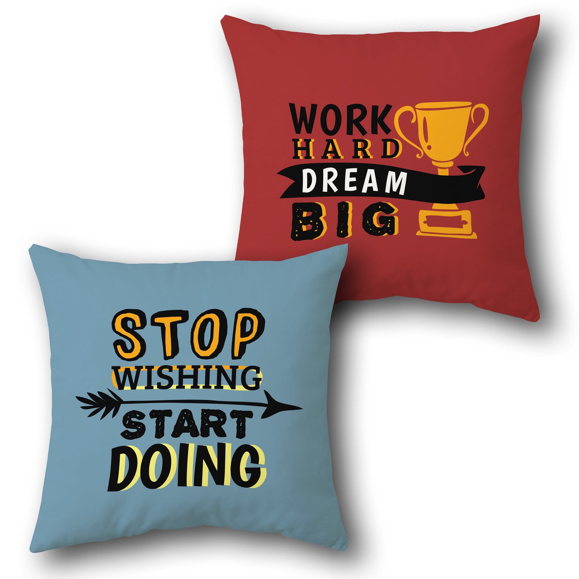 This cushion features a motivational design with the text "WORK HARD DREAM BIG" and a trophy graphic on one side, and "STOP WISHING START DOING" with an arrow on the other. The front side has a deep red base color with black and yellow text, while the back side has a light blue base color with black and orange text.