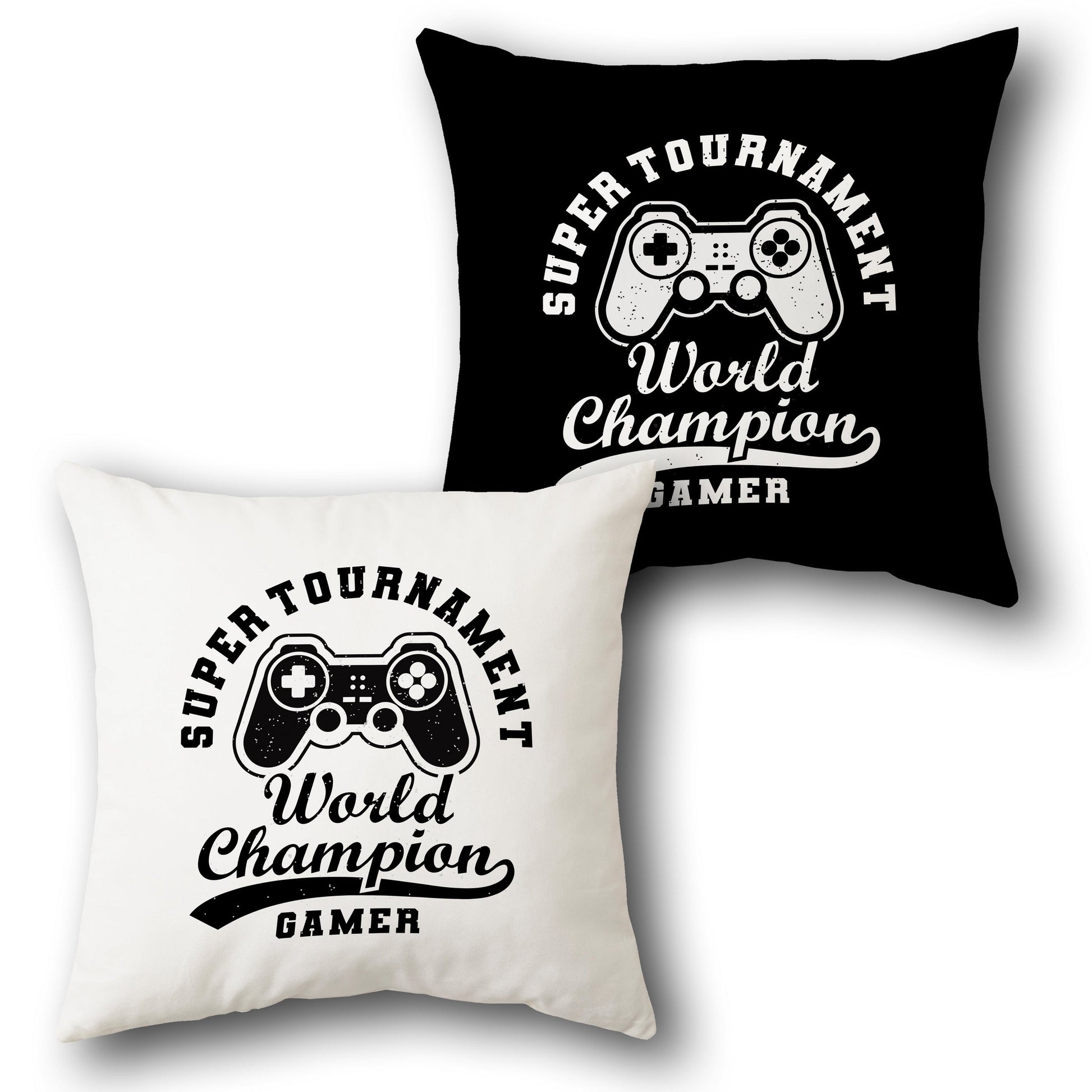This single cushion features a bold front and back design. The front showcases a game controller with the text "Super Tournament World Champion Gamer" in kaala (black) on a safed (white) base color. The back mirrors the same controller and text design in safed (white) on a black base color.